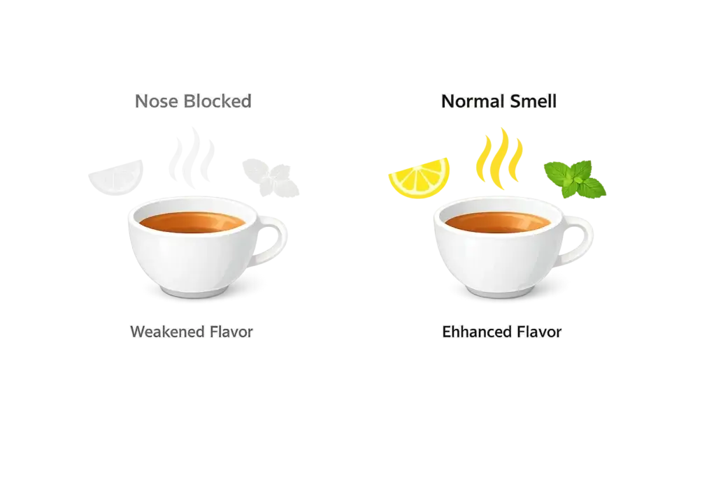 Keď piješ čaj, arómy sa dostávajú do nosa nielen zvonku, ale aj zvnútra — cez nosohltan. Tomuto sa hovorí retronazálne vnímanie. Práve to tvorí veľkú časť toho, čo nazývame „chuťou“.