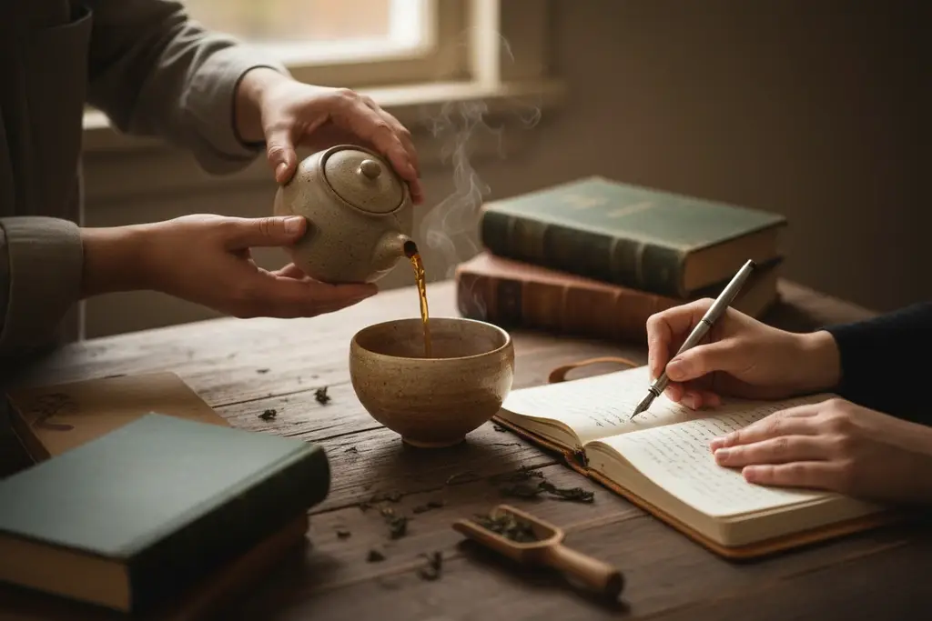 Sme Juraj a Zuzana — dvaja ľudia, ktorí veria, že každodenné rituály môžu meniť spôsob, akým žijeme. Juraj prináša skúsenosť s čajom, pestovaním a prípravou. Zuzana prináša slovo, ktoré hľadá ticho medzi vetami. Spolu tvoríme priestor, v ktorom sa prax a jazyk dopĺňajú: jeden skúša chute, druhá hľadá ich významy a príbehy.